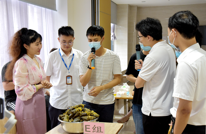 包粽子比賽通過(guò)人員交叉搭配進(jìn)行分組比賽。在嫻熟的“老手”作現(xiàn)場(chǎng)示范講解后,各組隊(duì)員紛紛動(dòng)手上陣。只見(jiàn)組員之間分工合作、相互配合,折粽葉、裝糯米、放餡料、裹扎繩……大家紛紛拿出自己的“拿手絕活”。30分鐘的比賽里洋溢著歡聲笑語(yǔ),各位選手巧手翻飛,一個(gè)個(gè)形態(tài)各異的粽子瞬間成型。最后,大會(huì)裁判以“速度、質(zhì)量、美觀、衛(wèi)生”為評(píng)判標(biāo)準(zhǔn)對(duì)各組粽子進(jìn)行了評(píng)選。