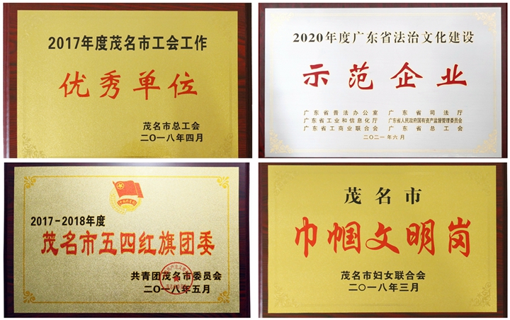 ▲集團(tuán)榮譽(yù)獎(jiǎng)牌(摘選) 幾年來(lái),集團(tuán)工會(huì)榮獲“茂名市工會(huì)工作優(yōu)秀單位”稱號(hào),集團(tuán)財(cái)務(wù)部女職工榮獲“茂名市巾幗文明崗”稱號(hào);集團(tuán)團(tuán)委成立青年志愿者服務(wù)隊(duì),助力雙創(chuàng)工作,連續(xù)三年榮獲“茂名市五四紅旗團(tuán)委”稱號(hào)。集團(tuán)憑借系列企業(yè)文化建設(shè)成果,先后榮獲 “中國(guó)企業(yè)文化建設(shè)典范企業(yè)”“廣東省先進(jìn)集體”“廣東省優(yōu)秀企業(yè)”“廣東省企業(yè)文化建設(shè)最佳實(shí)踐單位”“廣東省法治文化建設(shè)示范企業(yè)”等榮譽(yù),被譽(yù)為茂名市屬國(guó)有企業(yè)的標(biāo)桿與典范。 結(jié)語(yǔ) 十年積跬步,足下至千里;仨甑姆欠舱鞒,茂名港人矢志艱苦奮斗,勇于擔(dān)當(dāng)作為,爭(zhēng)當(dāng)茂名向海而興排頭兵,在茂名經(jīng)濟(jì)發(fā)展史上留下堅(jiān)實(shí)的足印。