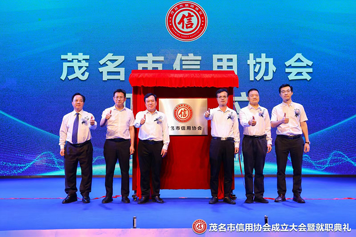 茂名市人大常委會副主任吳海強(qiáng)(右三),茂名市政協(xié)黨組副書記、副主席楊培基(左三),茂名市人民政府副秘書長何江(右二),茂名市發(fā)展和改革局黨組書記、局長朱春保(左二 ),廣東省發(fā)展改革委信用建設(shè)處一級主任科員譚強(qiáng)杰(右一),茂名市信用協(xié)會會長李文(左一)共同為茂名市信用協(xié)會揭牌。