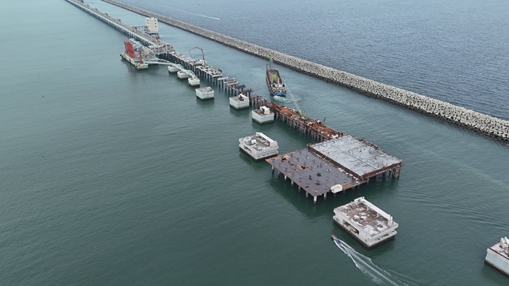 據(jù)悉,30萬噸級原油碼頭設(shè)計(jì)年吞吐量達(dá)1600萬噸,泊位長度達(dá)404米,碼頭共設(shè)計(jì)有145根樁基,由工作平臺(tái)及工作樓平臺(tái)的70根樁基和附屬管廊橋工程的75根樁基組成,其中工作平臺(tái)及工作樓平臺(tái)的70根樁基已于2023年底全部完工。